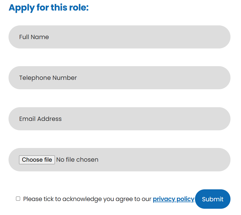 Full Name | Telephone Number | Email Address and a field to upload your CV, which should have all the other details needed.